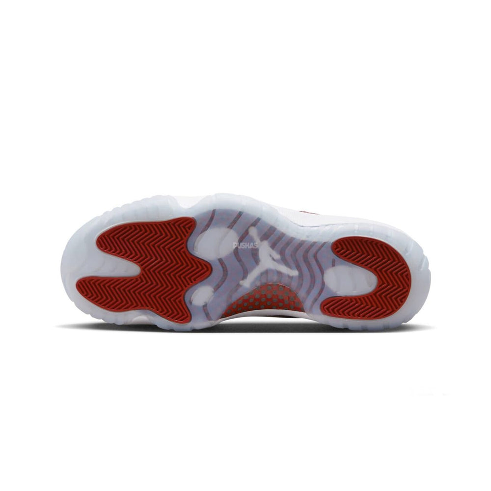 The Air Jordan 11 Retro 'Cherry' features a premium white leather upper with patent leather overlays in a vibrant 'Cherry' red hue, reminiscent of the original 1996 design. This striking colorway, coupled with the shoe's signature translucent outsole and carbon fiber shank plate, captures the essence of luxury and performance synonymous with the Air Jordan line.