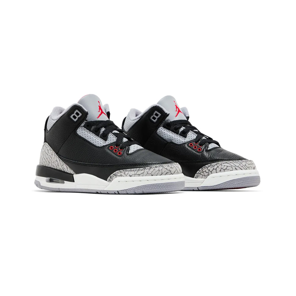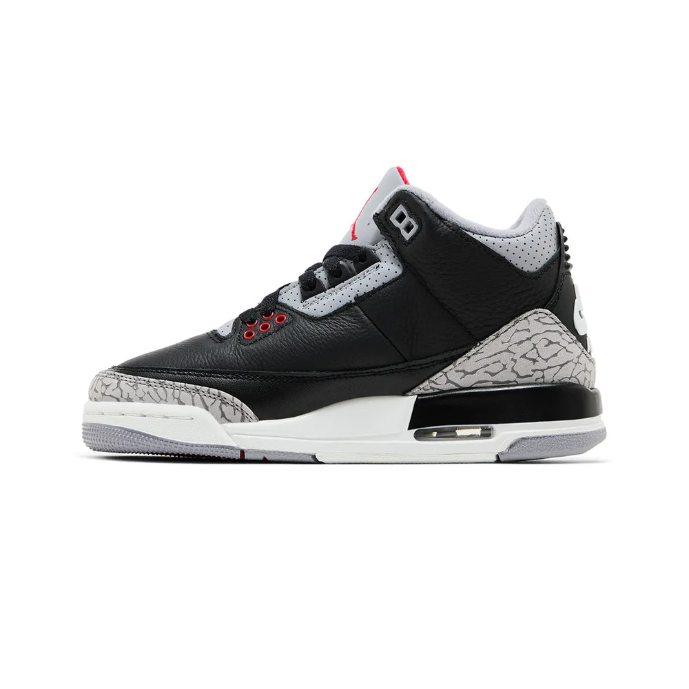 The Air Jordan 3 Retro 'Black Cement' GS (2024) brings back a true classic, enhancing the iconic design of the original 1988 release with a fresh take, tailored specifically for a younger audience. This model celebrates the rich history of the Air Jordan line, delivering a perfect blend of nostalgia and modern style. Overview The Air Jordan 3 Retro 'Black Cement' GS (2024) stays true to the original, featuring a premium leather upper in black with distinctive cement grey overlays. The elephant print on the toe cap and heel counter adds a signature touch, while the vibrant red accents on the tongue, midsole, and Jumpman logo provide bold contrast. The lightweight and durable rubber sole ensures comfort and traction, making it not only a style statement but also a functional sneaker for everyday wear. This iteration retains the classic Air Jordan 3 appeal while offering a refreshed design suited for the next generation. Key Highlights • Iconic 'Black Cement' Design: A direct nod to the 1988 original with black leather uppers and signature elephant print detailing. • Premium Materials: Constructed with high-quality leather and durable rubber, ensuring long-lasting wear and comfort. • Classic Air Jordan 3 Features: Features include a visible Air cushioning unit, the iconic Jumpman logo, and the timeless design that made the Air Jordan 3 a game-changer.