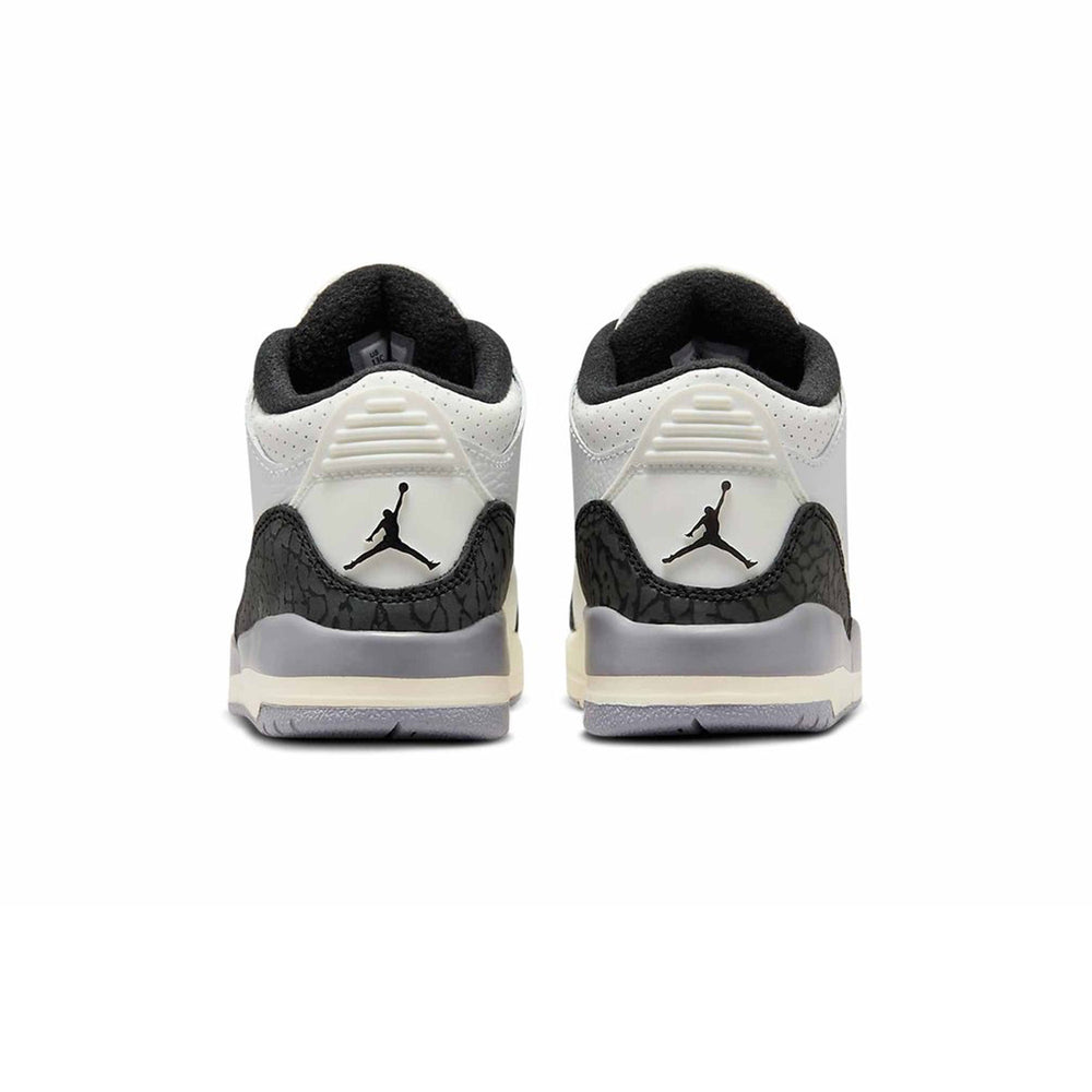 The Air Jordan 3 Retro 'Cement Grey' PS showcases a refined aesthetic with its "Cement Grey" upper, crafted from premium leather for both durability and comfort. The iconic elephant print accents on the toe and heel panels add a distinctive, signature touch, paying homage to the original 'Cement' colorway that first debuted in 1988. The sneaker features a contrasting "Black" midsole and "White" outsole, enhancing its classic look while ensuring a versatile style that pairs effortlessly with various outfits. The Jumpman logo on the tongue and the heel provides an authentic touch, complementing the shoe's heritage-inspired design.