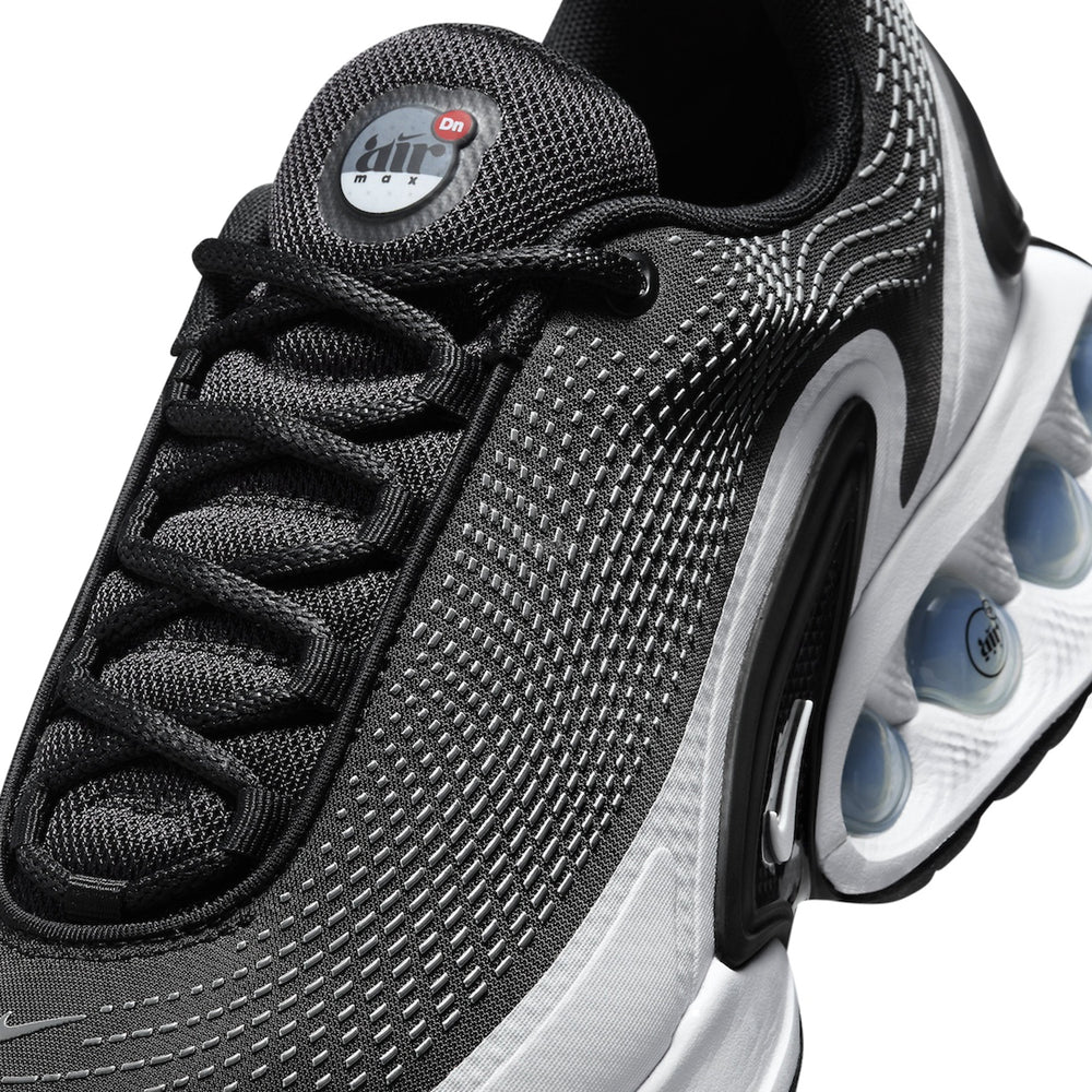 Featuring a Black, White, Cool Grey, and Pure Platinum palette, the Air Max DN 'Black White Cool Grey' showcases a seamless upper paired with a TPU shank clip for unrivaled style and support. At the heart of the sneaker, Dynamic Air cushioning technology introduces a dual-chamber and four-tubed Nike Air unit, delivering exceptional comfort and responsiveness. This state-of-the-art Air system adapts fluidly to your movements, offering optimal bounce and a smooth transition that sets a new standard for wearing Air Max.