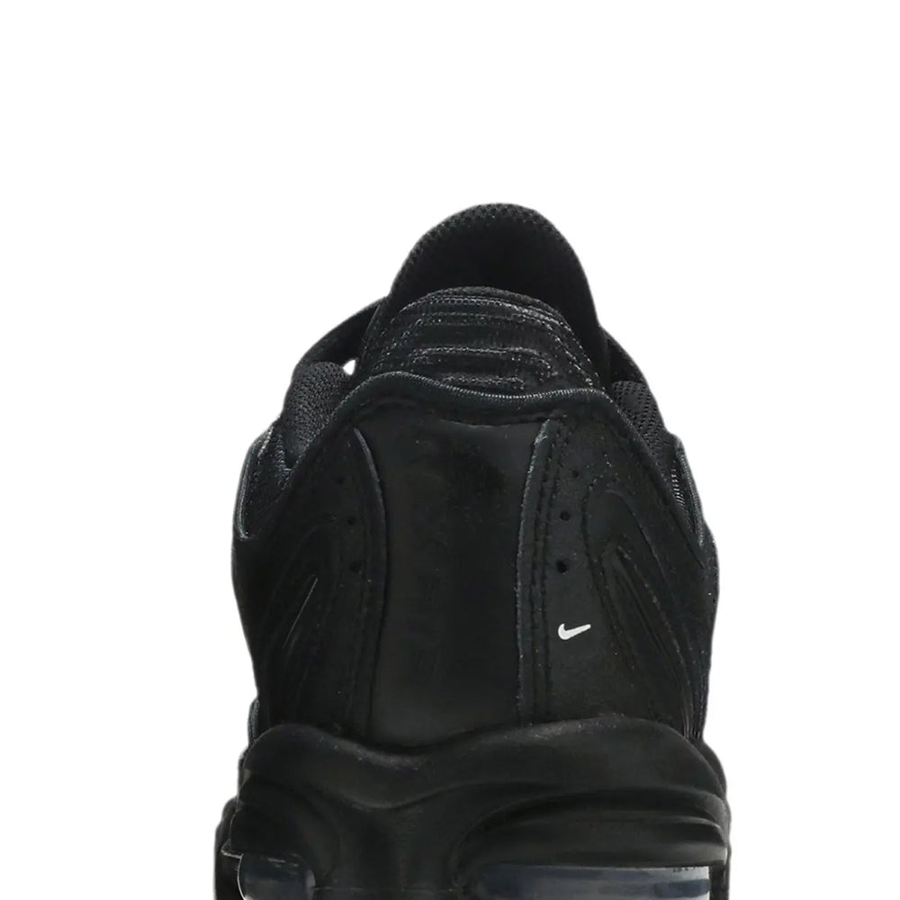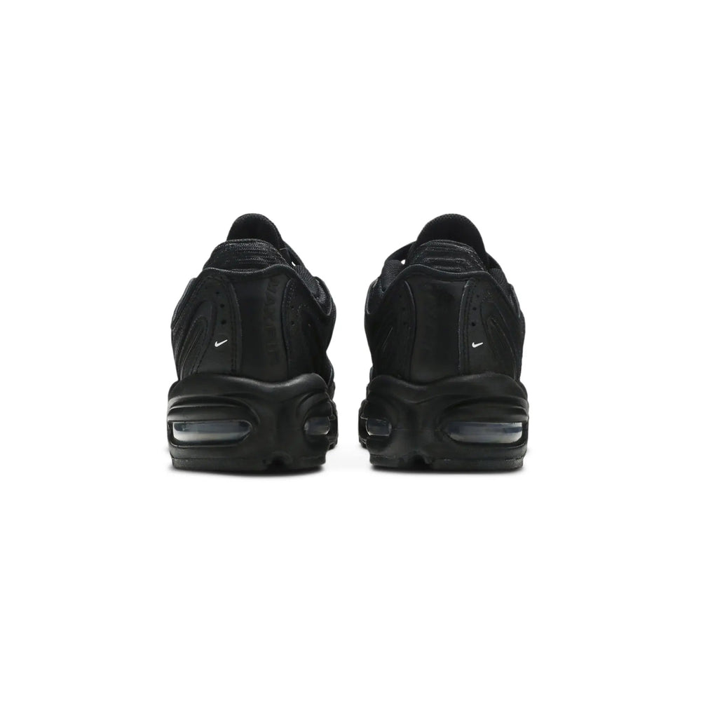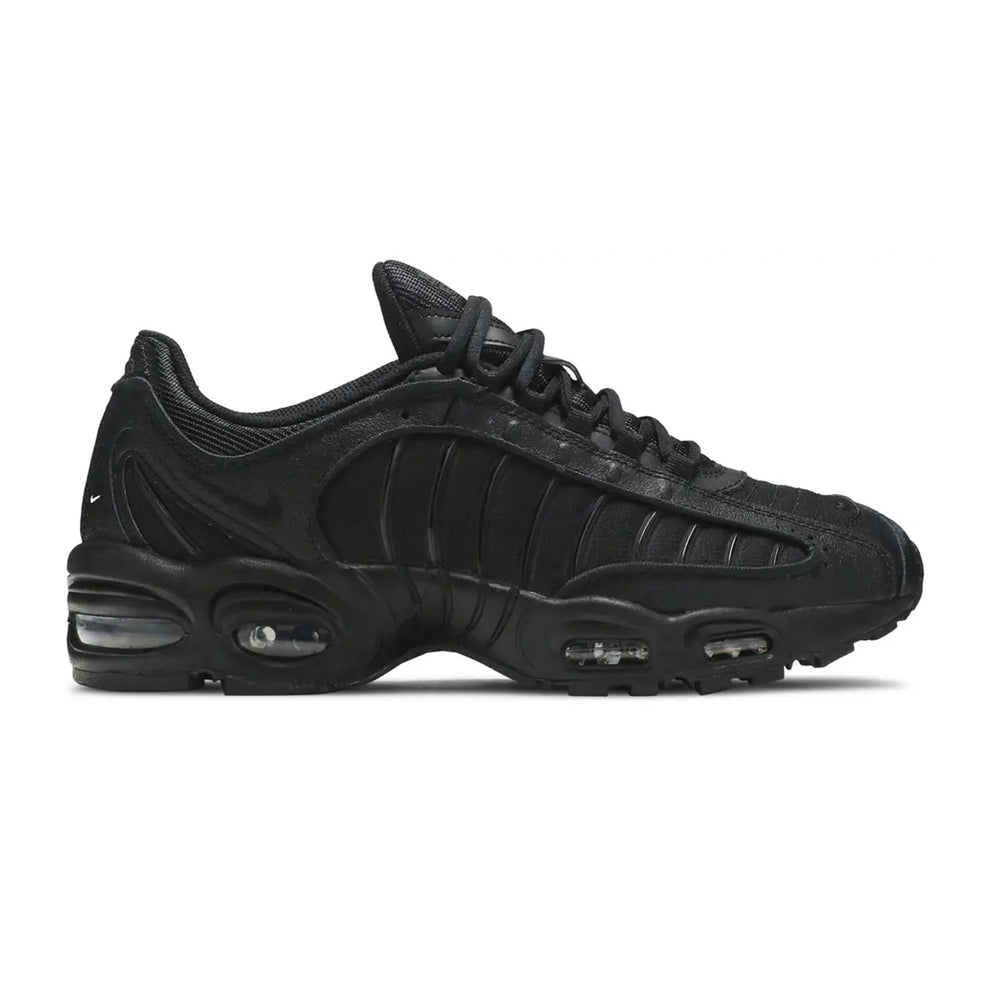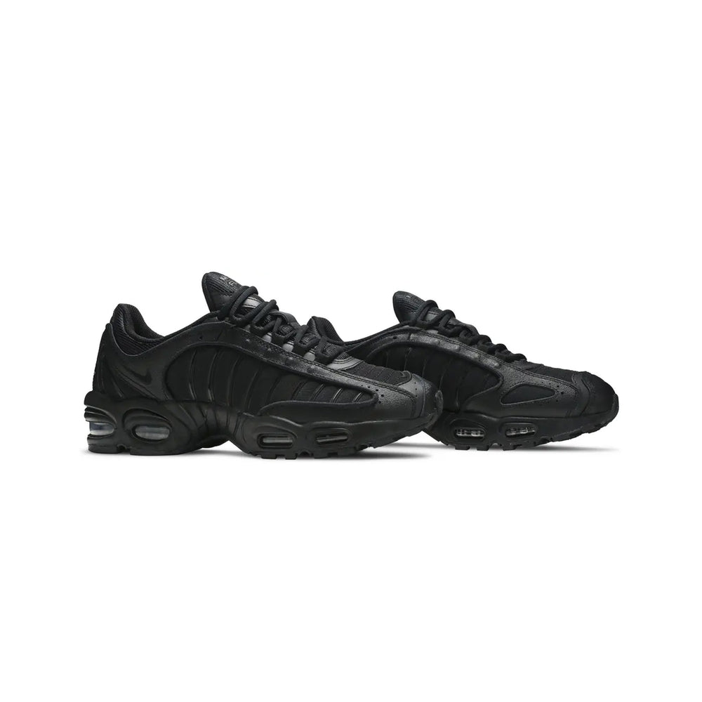 The Nike Air Max Tailwind 4 'Triple Black' (2019) delivers an elegant yet rugged take on a classic silhouette, embodying the legacy of the Air Max line with a modern, monochrome twist. Known for its bold design and performance heritage, this iteration stands out for its all-black aesthetic that resonates with both fashion-forward individuals and athletes. Overview The Nike Air Max Tailwind 4 'Triple Black' offers a stealthy, head-to-toe black colorway that highlights its dynamic design elements. Crafted with a blend of premium leather and mesh, the upper provides a balance of durability and breathability. Horizontal, ribbed lines run along the sides, emphasizing the sneaker's structure while enhancing its visual appeal. The midsole features visible Air Max cushioning units in the forefoot and heel, ensuring superior comfort and shock absorption. The outsole's rubber traction pattern delivers reliable grip, making it suitable for various surfaces. This model successfully bridges streetwear and performance, offering a versatile option for sneaker enthusiasts. Key Highlights • Sleek 'Triple Black' Design: A fully monochrome palette that seamlessly integrates style and function, appealing to those who appreciate understated, versatile footwear. • Signature Air Max Cushioning: Equipped with Air units in both the forefoot and heel for unmatched comfort and impact protection. • Premium Material Composition: The combination of leather and breathable mesh ensures durability and comfort, ideal for all-day wear.