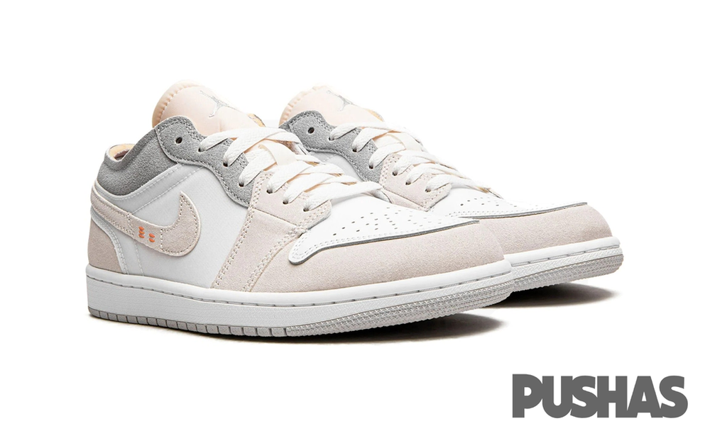 The Air Jordan 1 Low Inside Out Cream White Light Grey GS has a deconstructed appearance with a light grey smooth leather upper with matching light grey Durabuck Swooshes and overlays.