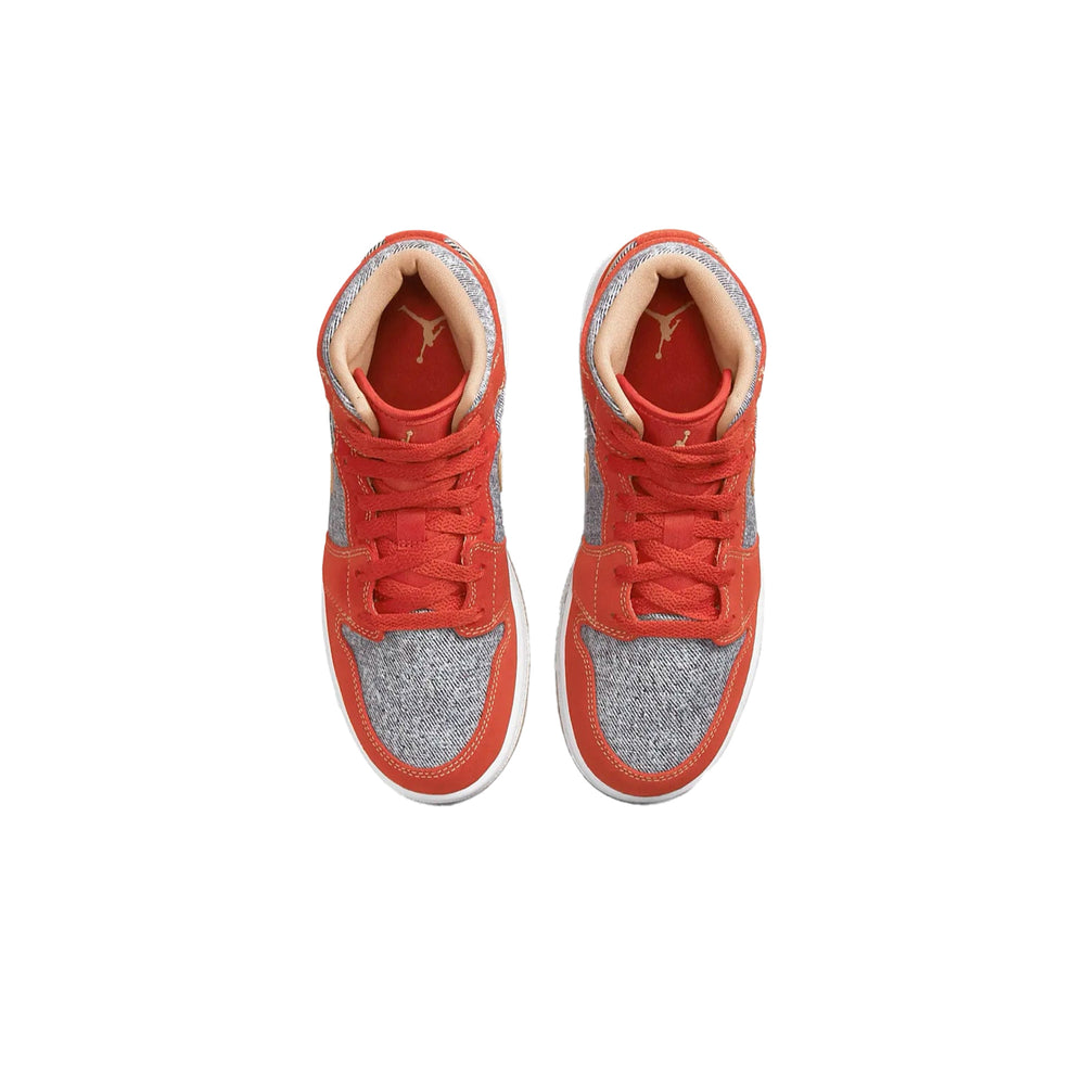 The Air Jordan 1 Mid 'Denim Red' GS features a striking combination of materials and colors that set it apart. The sneaker showcases a durable denim upper, contrasted by bold red accents that highlight the Swoosh, collar, and laces, creating a vibrant yet balanced look. The classic Air Jordan wings logo is prominently displayed on the ankle, paying homage to the brand's storied history. A white midsole and red outsole complete the design, offering both aesthetic appeal and functional grip. The padded collar and cushioned insole ensure a comfortable fit, making it suitable for all-day wear.