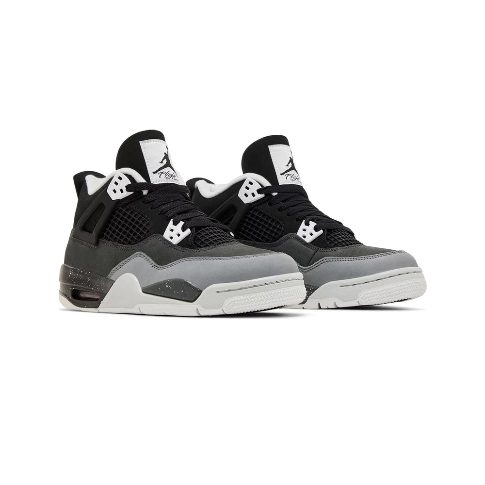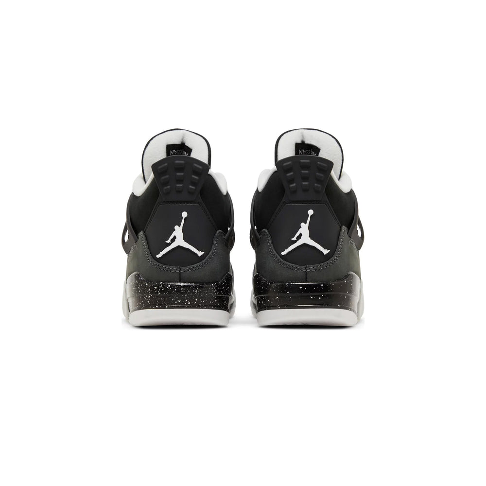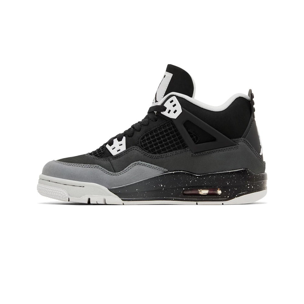 The Air Jordan 4 Retro 'Fear' GS (2024) is constructed with a premium combination of nubuck and suede, creating a striking texture that complements its deep, gradient color scheme. The upper predominantly showcases an elegant blend of dark grey, anthracite, and black hues, enhanced by subtle speckles along the midsole for a dynamic visual impact. Mesh netting on the side panels and vamp provides breathability while maintaining the shoe’s iconic look. Accents of white on the midsole and Jumpman logo contrast against the darker tones, delivering a balanced aesthetic that exudes both sophistication and edge. The interior is lined with soft fabric for comfort, while the Air-Sole unit in the heel ensures cushioning for everyday wear.