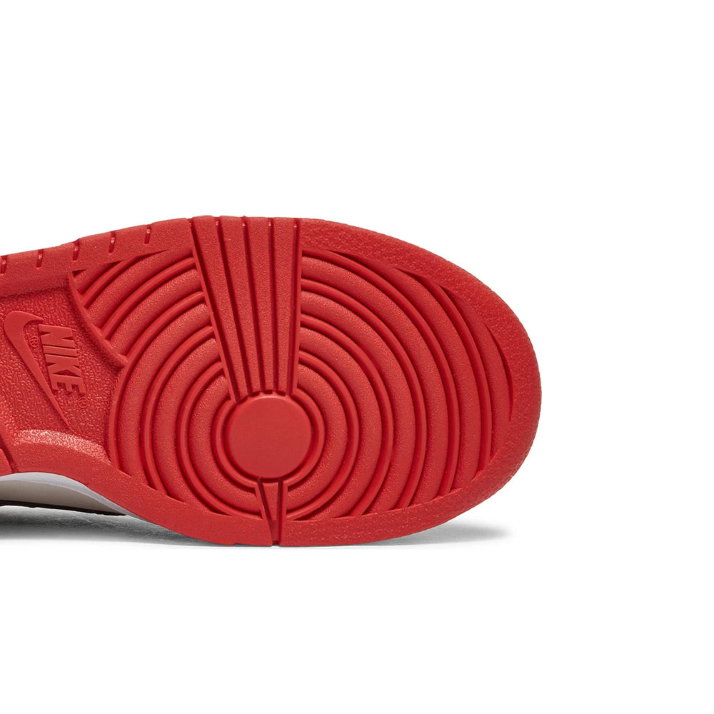 Crafted with meticulous attention to detail, the Nike Dunk Low 'EMB NBA 75th Anniversary Chicago' GS features a premium leather upper that combines the signature colors of the Chicago Bulls: a bold "Varsity Red" overlays contrasted with a crisp white base, and striking black accents. The midsole is adorned with a classic white finish, paired with a solid black rubber outsole for durability and traction. Noteworthy is the special "75th Anniversary" branding on the tongue tag, a unique diamond-shaped logo that signifies the milestone celebration. The Swoosh is rendered in black, seamlessly blending with the rest of the design while adding a touch of sleekness. This edition also includes embroidered "NBA" logos on the heel, connecting the sneaker directly to the league's history.