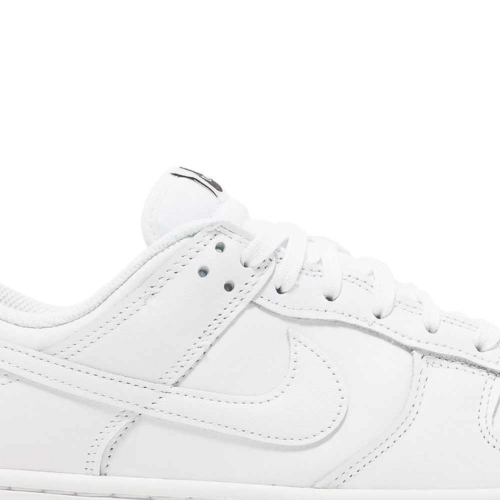 Crafted with a clean and crisp white leather upper, the Nike Dunk Low 'Triple White' Women's (2021) exudes simplicity and sophistication. The tonal design is consistent throughout, with the white Swoosh, laces, midsole, and outsole creating a seamless, monochromatic look that enhances the shoe's sleek profile. This model stays true to the Dunk's basketball heritage, offering a comfortable fit and durable build, making it suitable for both casual wear and athletic performance. The shoe’s versatility is unmatched, effortlessly complementing various outfits while maintaining a fresh and modern edge.