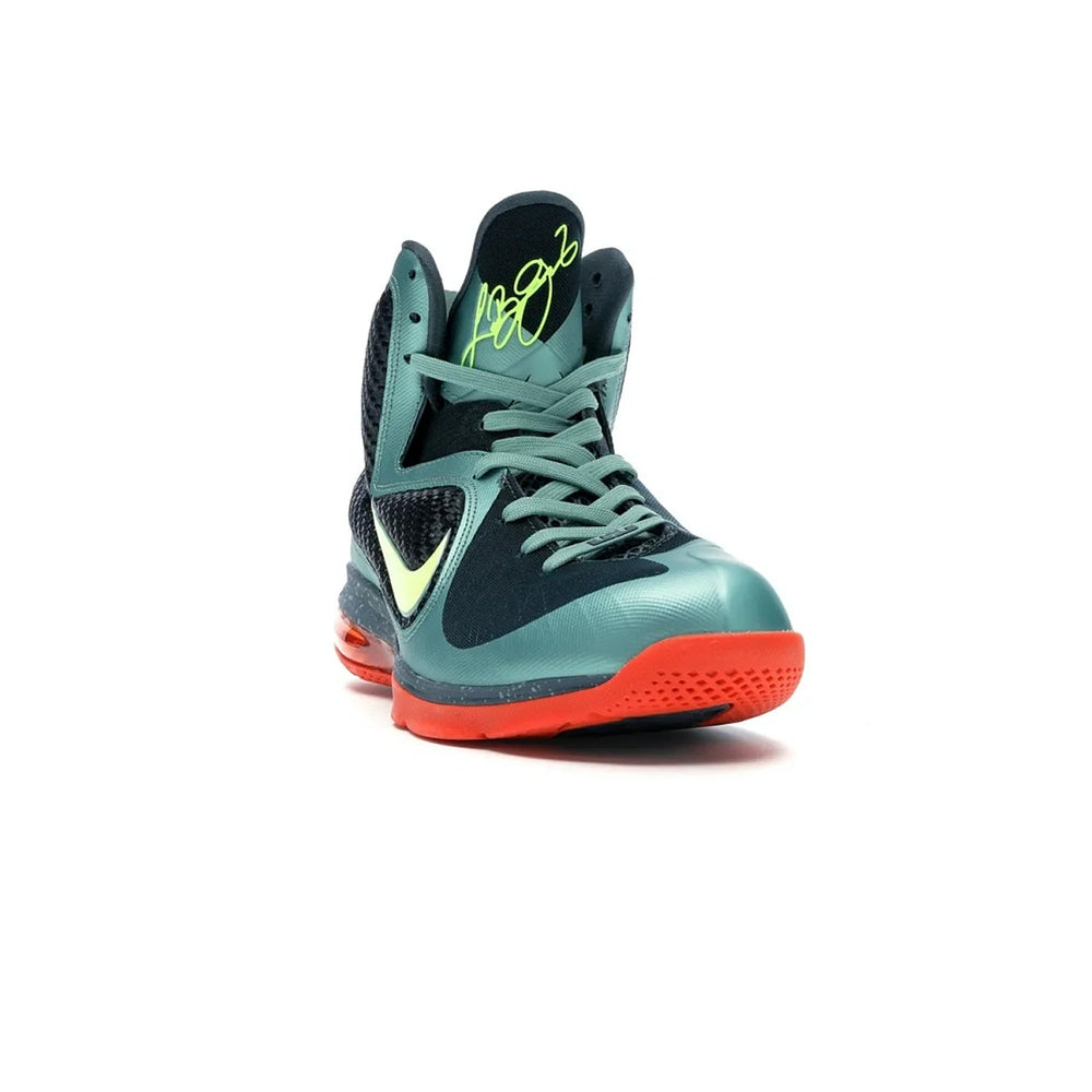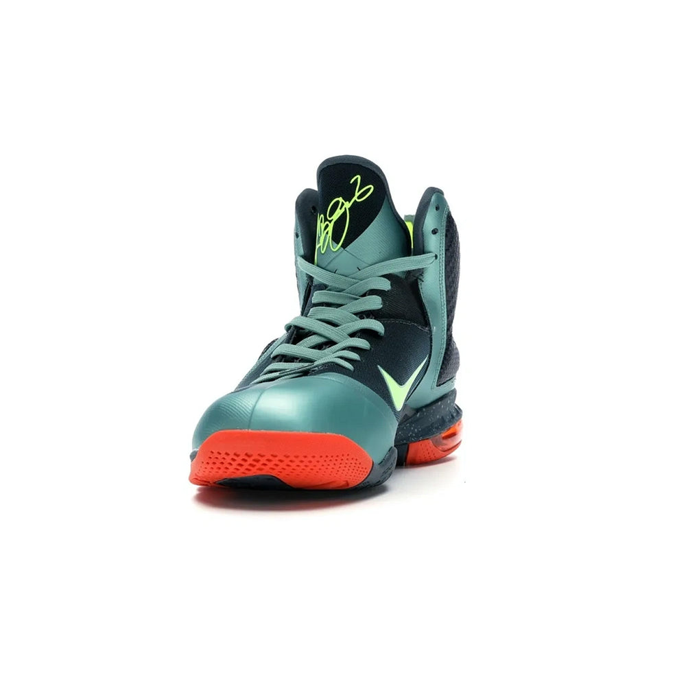 The Nike LeBron 9 'Cannon' (2011) stands as a bold statement in the history of LeBron James' signature sneaker line, combining cutting-edge technology with a vibrant, military-inspired color palette. Originally debuted during LeBron's preseason tour in Miami, this iconic silhouette is revered by basketball fans and sneaker enthusiasts alike. Overview The Nike LeBron 9 'Cannon' features a striking "Cannon" green base, accented by bright "Volt" and "Team Orange" hues, symbolizing strength and energy. The upper is constructed with a combination of Hyperfuse and Flywire technology, ensuring lightweight durability and exceptional lockdown support. A Max Air 180 unit in the heel and Zoom Air in the forefoot provide unparalleled comfort and responsiveness on the court. The midsole flaunts speckled detailing for added visual appeal, while the outsole boasts a multidirectional traction pattern designed for superior grip. The sneaker's bold aesthetic and innovative construction make it a standout piece in the LeBron series. Key Highlights • Vibrant 'Cannon' Colorway: Showcases a military-inspired green with bright "Volt" and "Team Orange" accents, delivering a striking visual impact. • Advanced Performance Features: Hyperfuse and Flywire technologies ensure a lightweight yet durable upper, paired with responsive cushioning for peak athletic performance. • Collector's Favorite: Released as part of the 2011 LeBron 9 lineup, this colorway holds a special place among collectors and basketball enthusiasts.