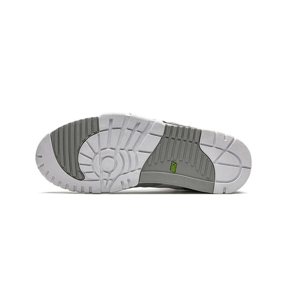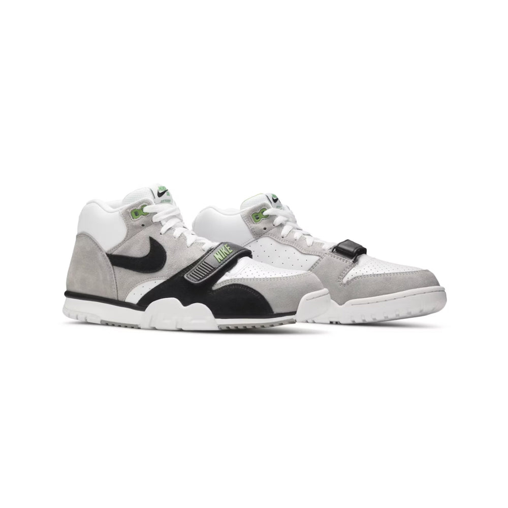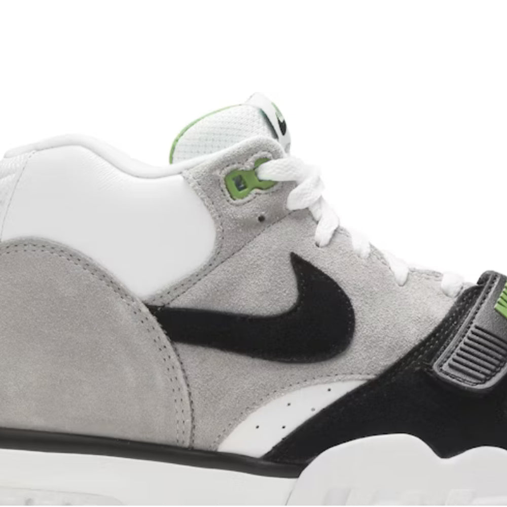 The 'Chlorophyll' colorway, a nod to the original Air Trainer 1, features a clean and versatile palette. The upper combines premium white leather with contrasting shades of grey, creating a clean and understated aesthetic. The bold 'Chlorophyll' green accents on the Swoosh, heel, and outsole add a pop of color, elevating the sneaker's visual appeal.