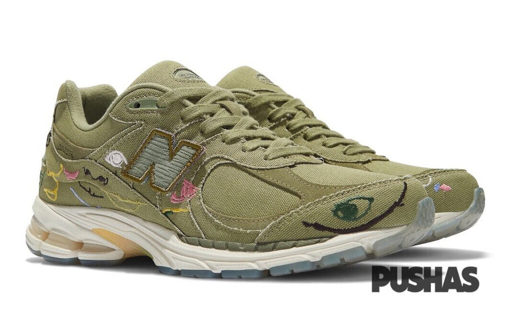 The olive canvas upper of the New Balance 2002R Bryant Giles What Now? has pastel embroidery, frayed overlays, and detachable velcro New Balance side patches. The "What Now?" embroidery on the heel is a nod to Giles' 2019 film What Now?, which had its world premiere at Miami's Art Basel in December of that same year. The design is then finished with unique insoles that feature paintings by Giles and a semi-transparent outsole.