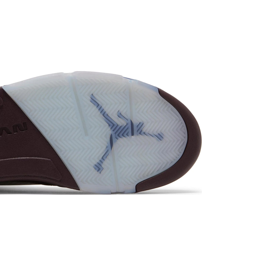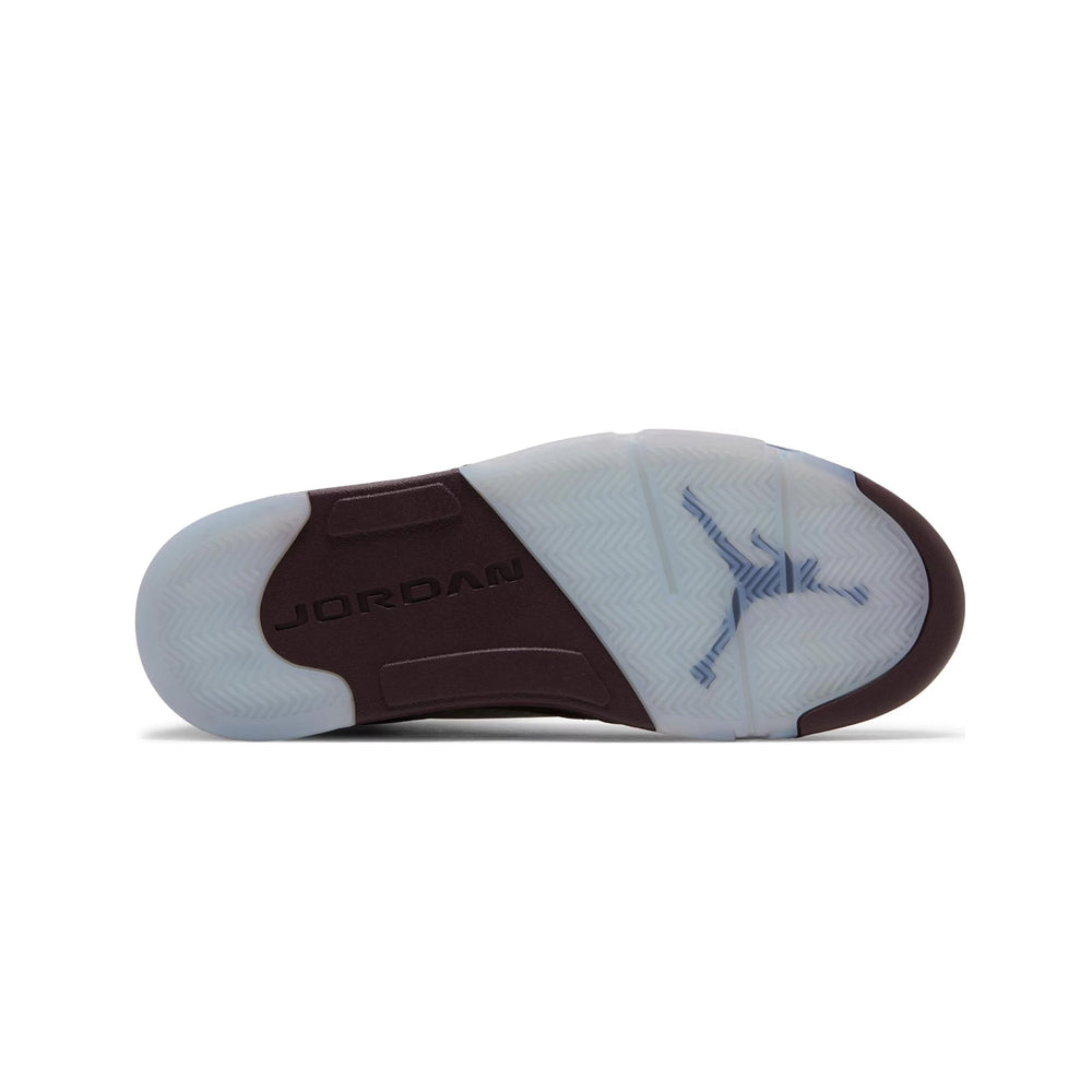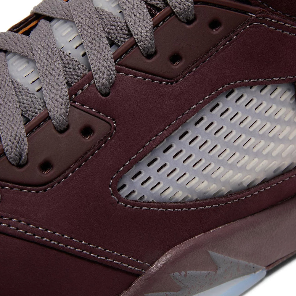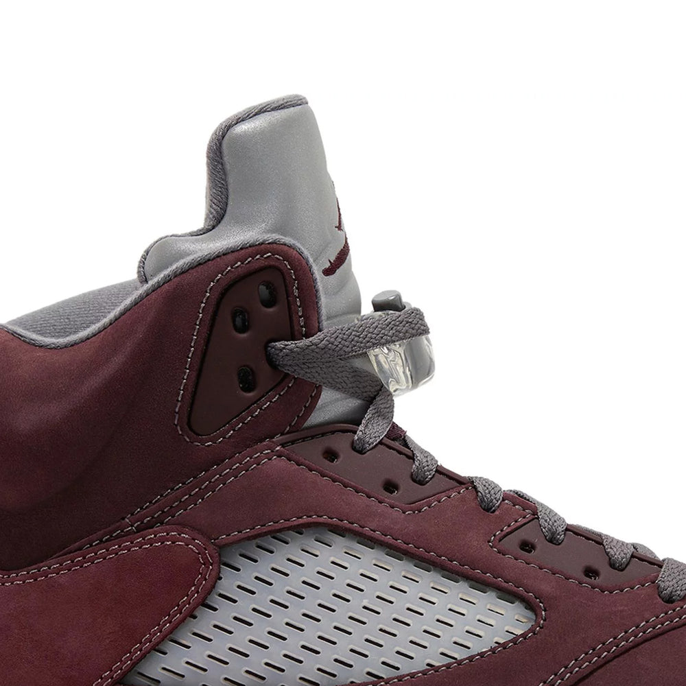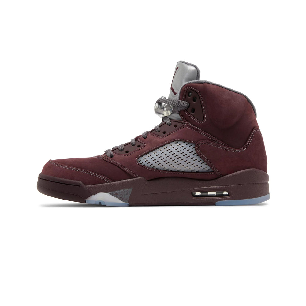 The Air Jordan 5 Retro 'Burgundy' GS features a rich suede upper in a deep burgundy hue, exuding sophistication and timeless appeal. This opulent upper is complemented by contrasting silver accents on the tongue and the signature “23” embroidered on the side, adding a touch of elegance and modernity. The shoe also incorporates the classic translucent mesh side panels, maintaining the breathable comfort that the Air Jordan 5 is known for. The midsole is adorned with a speckled shark tooth design in silver and white, providing a dynamic visual contrast that enhances the overall aesthetic. The semi-translucent icy outsole not only adds to the sneaker's striking appearance but also ensures durability and traction.
