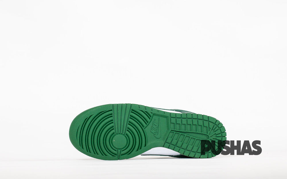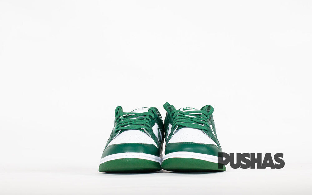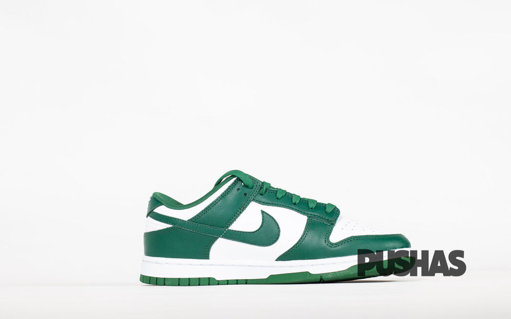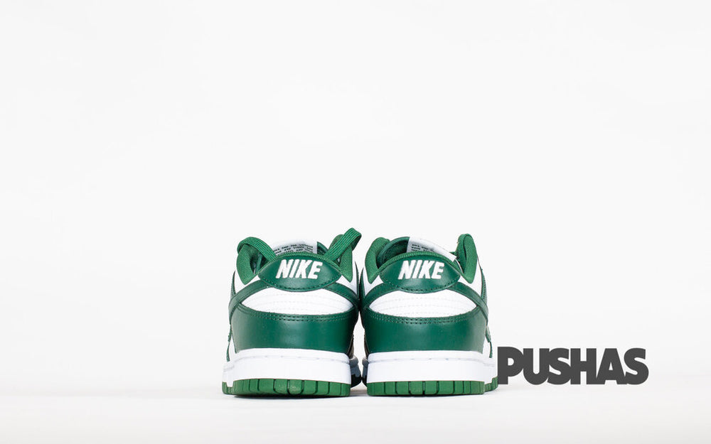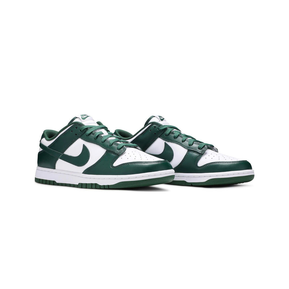 Crafted with a crisp "White" leather base, the Nike Dunk Low 'Michigan State' is adorned with "Green Pine" overlays that pay homage to the Spartans’ signature hues. The green leather panels envelop the toe box, eyestays, and heel, creating a bold yet cohesive look. The Nike Swoosh, rendered in the same vibrant green, seamlessly integrates with the sneaker's overall design, while the laces, tongue tag, and outsole also sport the rich "Green Pine" color, enhancing the uniformity and visual appeal of the shoe. The white midsole provides a sharp contrast, ensuring a clean and balanced finish. Key details such as the Nike branding on the heel tab and the tongue label are meticulously designed, reflecting the high standards of craftsmanship synonymous with the Dunk line.