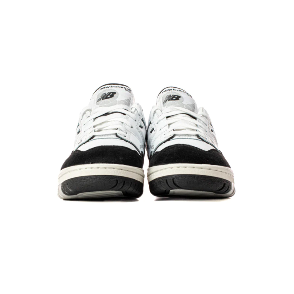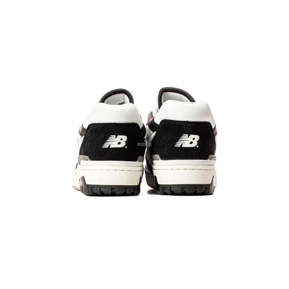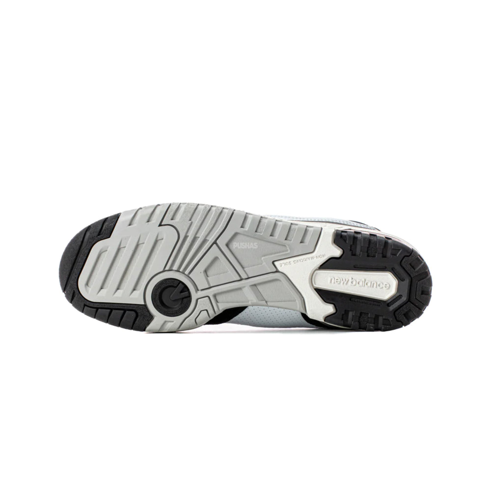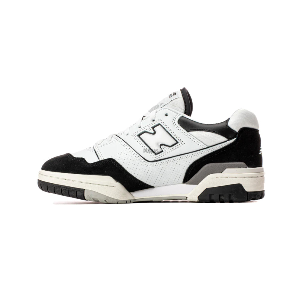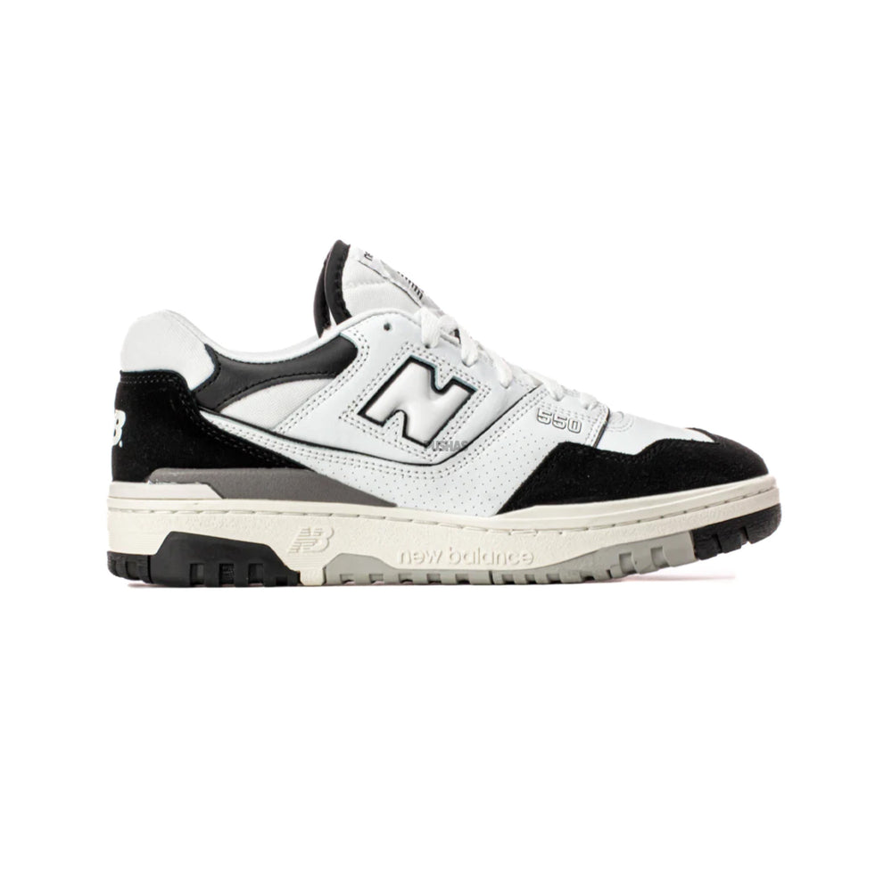 The upper of the New Balance 550 White Black Rain Cloud is made of synthetic leather in two tones. Additionally, it has a white foundation with holes in it.