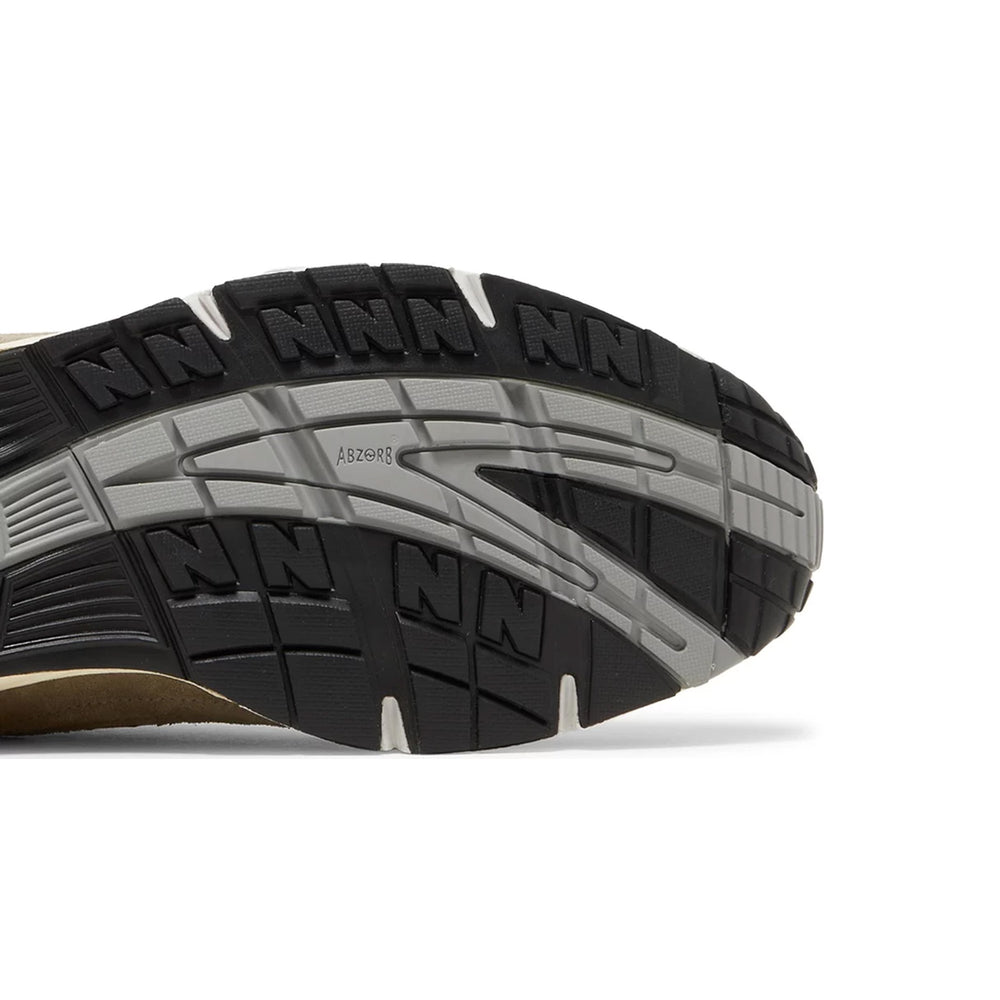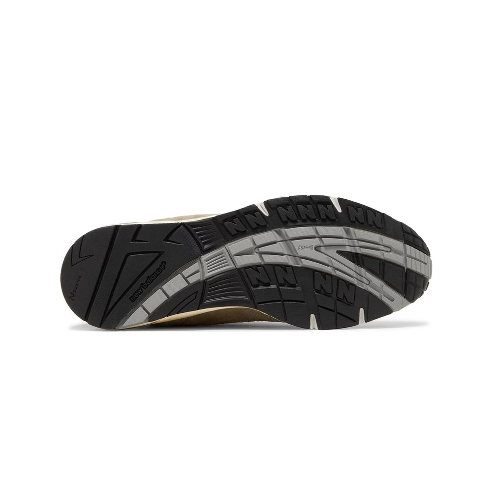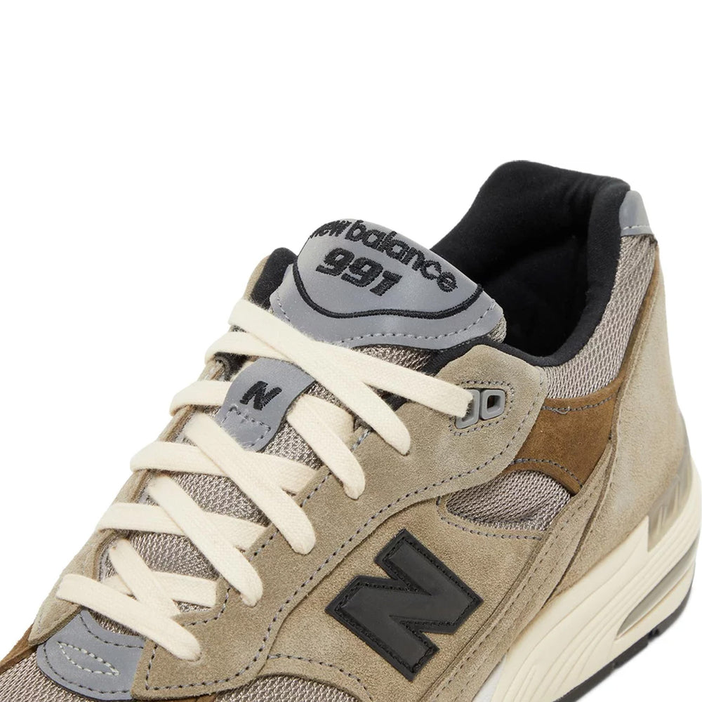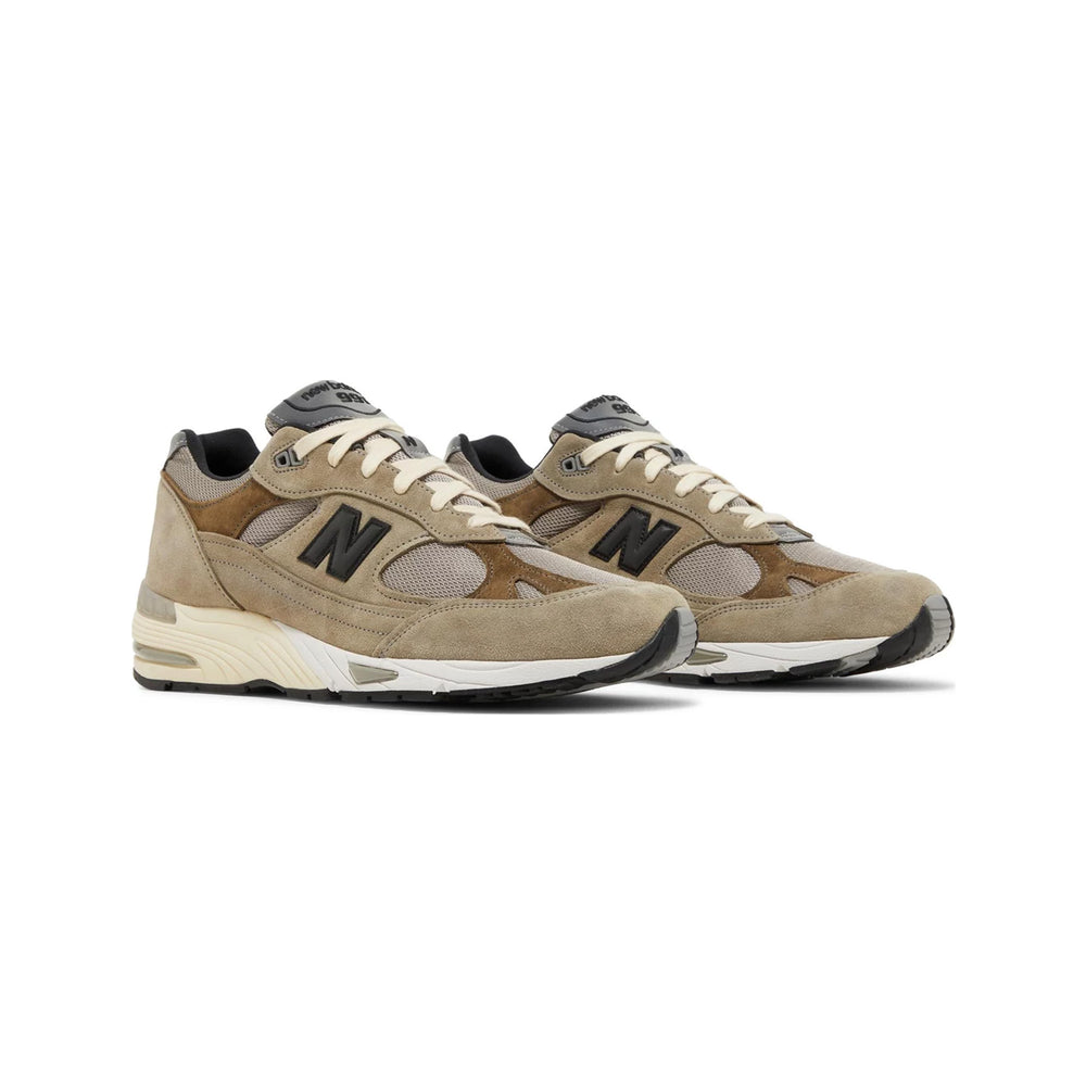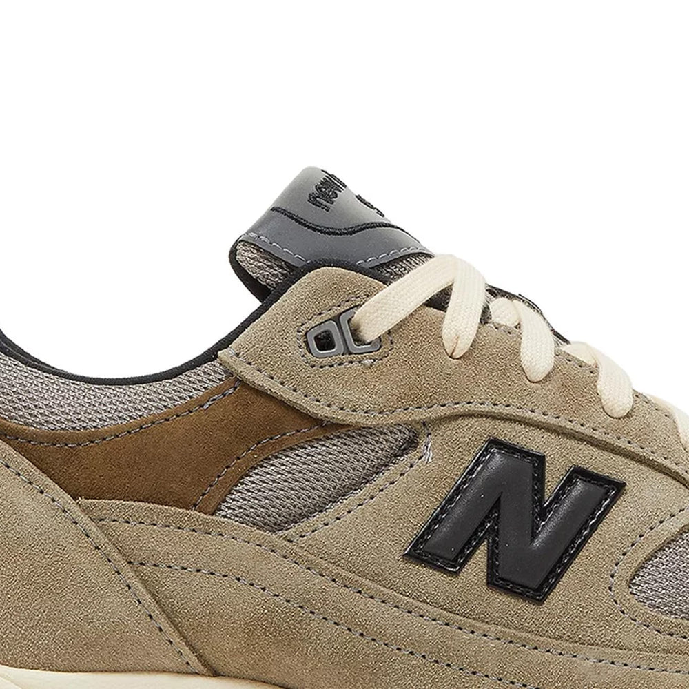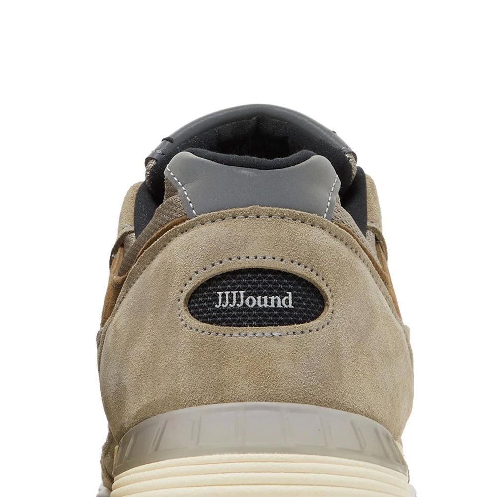 The brown and grey quality suede and mesh top of the New Balances 991 JJJJound Grey Olive are British-made. The heel and insole of the sneakers have JJJJound logo. Along with extra black polyester laces, the sneakers come with cream laces as well.