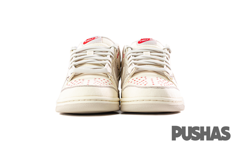 The Pale Ivory denim upper of the Nike Dunk Low Orewood Brown Sashiko is finished with Orewood Brown contrast stitching. The heel tab, eyelets, and toe box all have red Sashiko stitching. The tongue and insoles have subtle red Nike branding.
