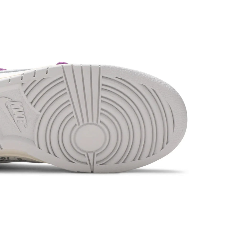 The Nike Dunk Low x Off-White 'Lot 48' features a canvas and leather upper in a neutral grey base, offering a minimalist foundation that highlights the vibrant accents. Neon green secondary laces and a metallic silver Swoosh provide dynamic contrasts, while signature Off-White details such as the Helvetica text on the medial side, exposed foam tongue, and zip-tie emphasize the collaboration's unique identity. The sneaker sits on a cream midsole and a light grey outsole, completing the subtle yet striking design. As part of "The 50," each pair includes a lot-specific badge and individually numbered details, ensuring exclusivity.