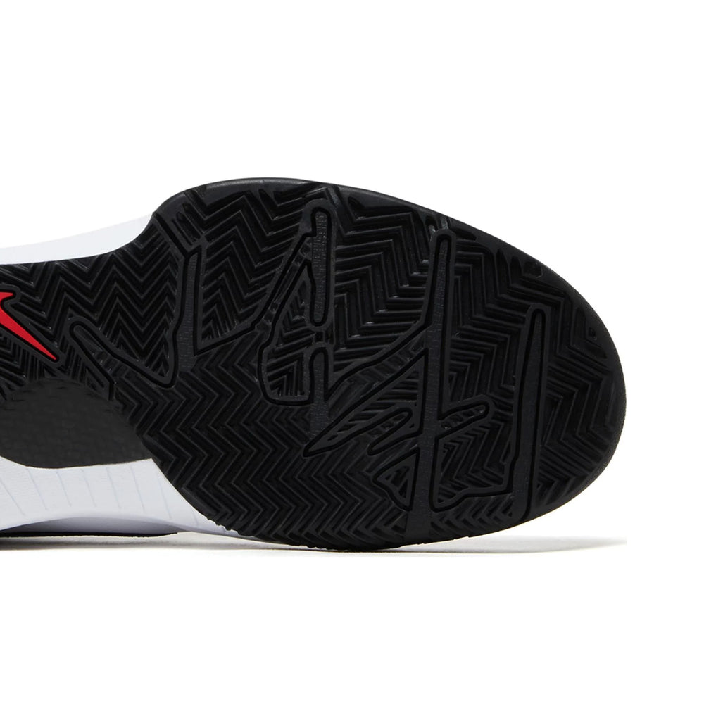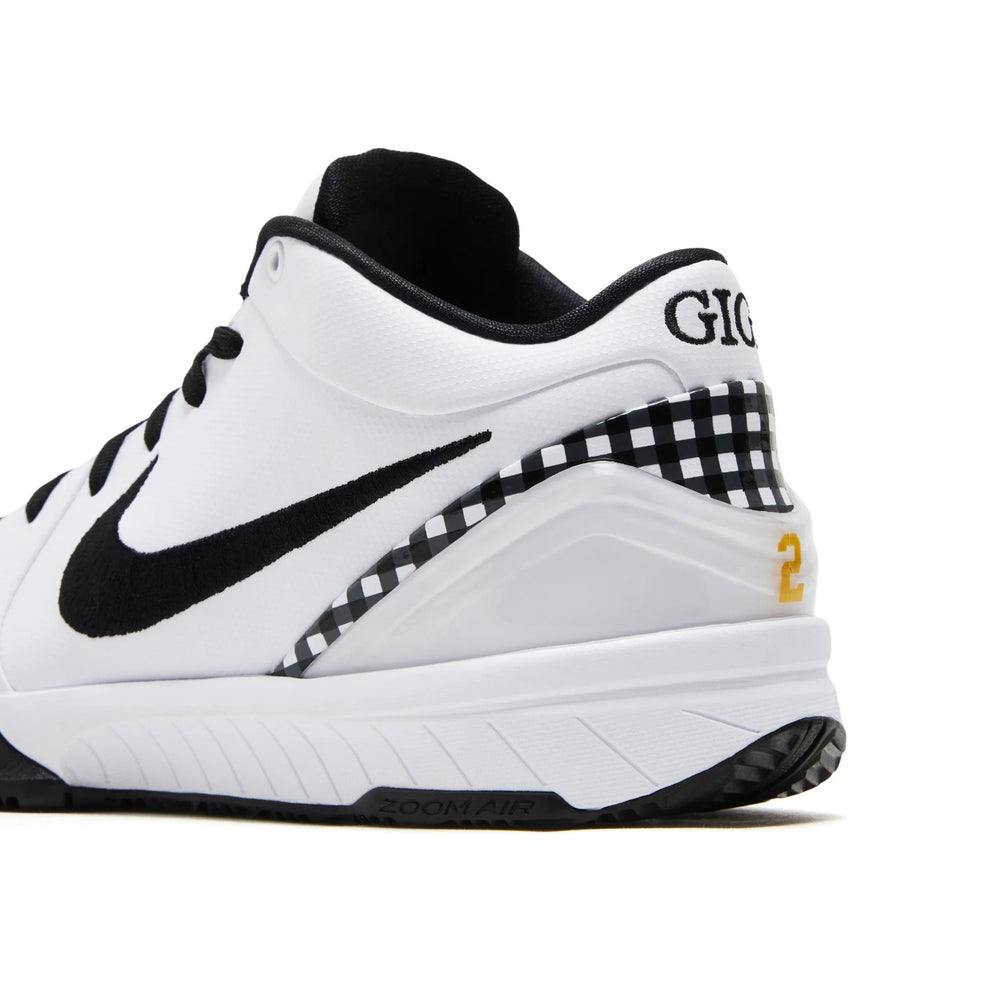 The 'Mambacita Gigi' edition showcases a sleek "White" and "Black" color scheme, with a clean white leather upper accentuated by subtle black details. The shoe features a textured black overlay that recalls the iconic snakeskin pattern associated with Bryant's 'Mamba' persona. A unique touch is found in the "Gigi" inscription on the heel, a heartfelt nod to Kobe's daughter. The sneaker's translucent outsole reveals a distinctive black and white speckled design, enhancing both visual appeal and traction. The innovative Zoom Air cushioning ensures top-tier performance on the court, while the responsive foam midsole delivers comfort and stability. This Protro variant integrates contemporary updates to improve durability and support, making it a fitting homage to the Bryant legacy.