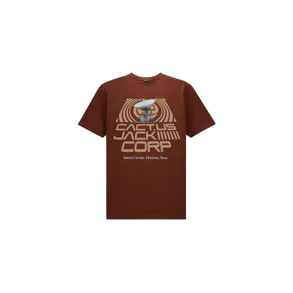 Crafted from high-quality cotton, the T-shirt features a rich brown hue, embodying a versatile yet bold aesthetic that seamlessly integrates into any wardrobe. The shirt's front is adorned with a minimalist yet striking "CACT.US CORP" logo, an emblem of Scott's creative enterprise. On the back, the Nike Swoosh is prominently displayed, symbolizing the brand's enduring legacy in sportswear. The design is further enhanced with subtle, co-branded detailing, ensuring an exclusive, collector's appeal. The T-shirt's construction promises a comfortable, relaxed fit, making it an ideal choice for both casual and athleisure wear.